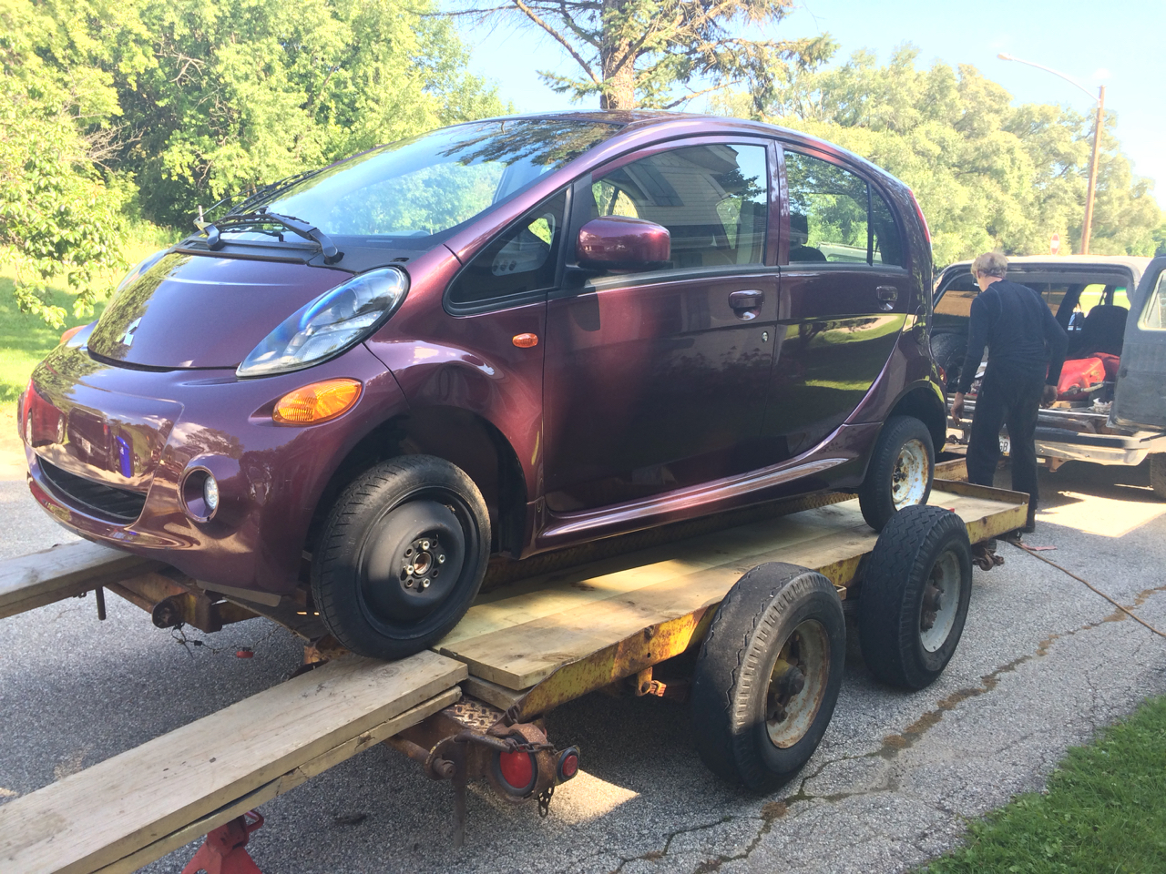 After exchanging money and the salvage title, Pdon was on the road, and I got to wave goodbye to the purple iMiEV.