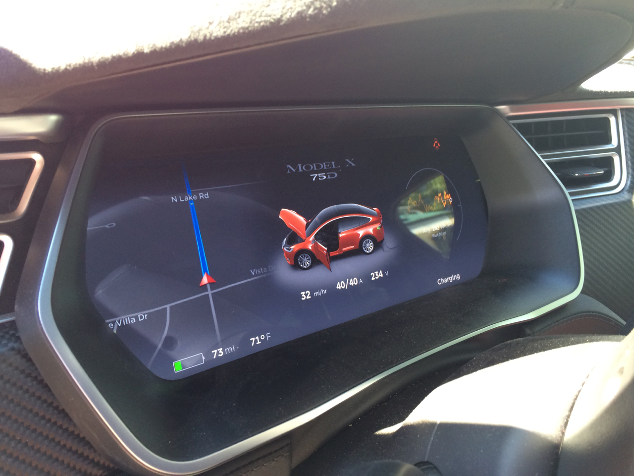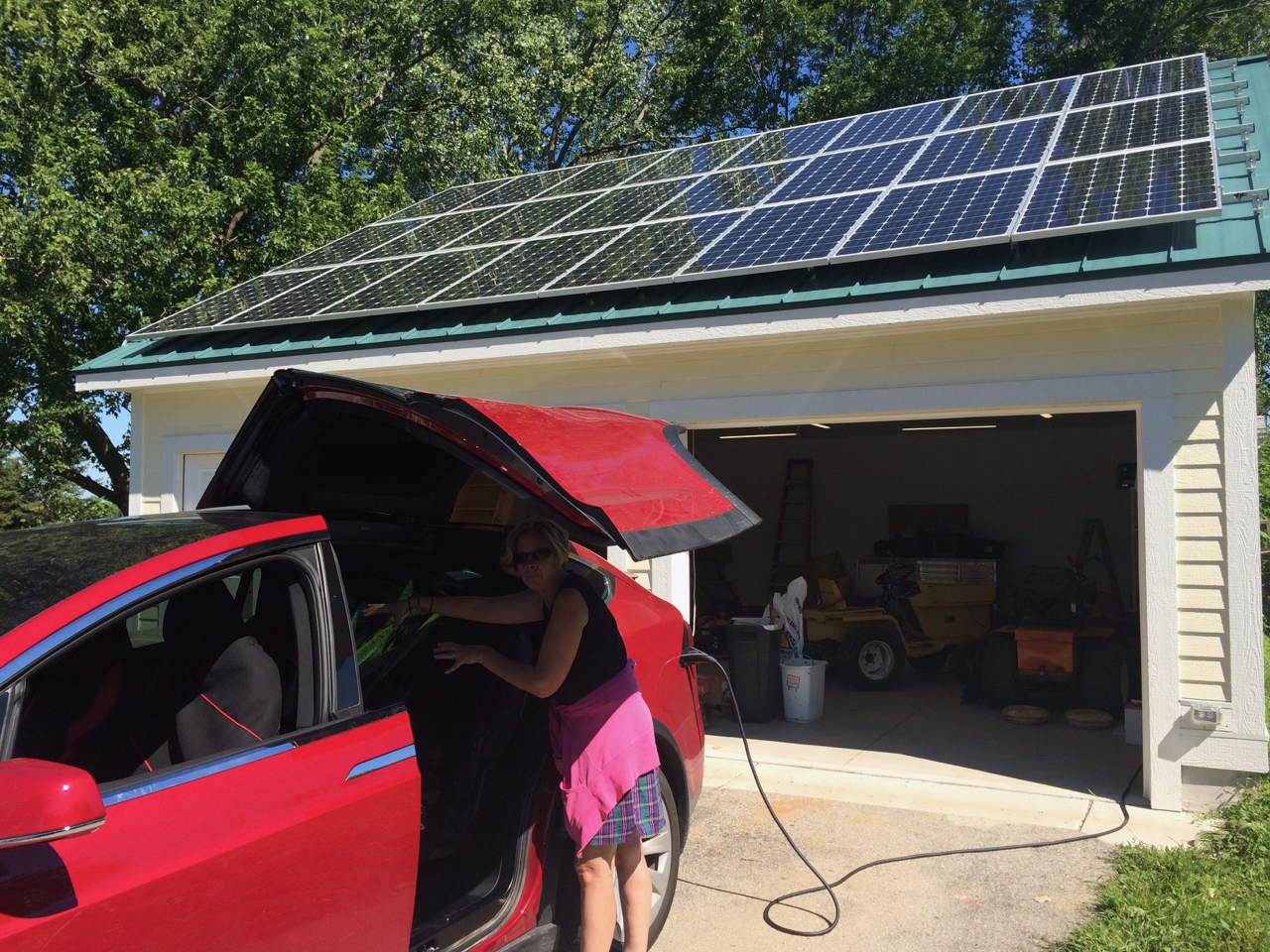 We hooked her up to my NEMA 14-50 outlet with the Model X charging at 40 amps. While the car charged, we chatted and I gave her the quick tour of the garage and the solar system. The car charged for a little over an hour. Although 40 amps is a whole lot more power than my solar panels can produce, the solar is making power all day. Two hours of solar today should completely cover charging the Tesla.