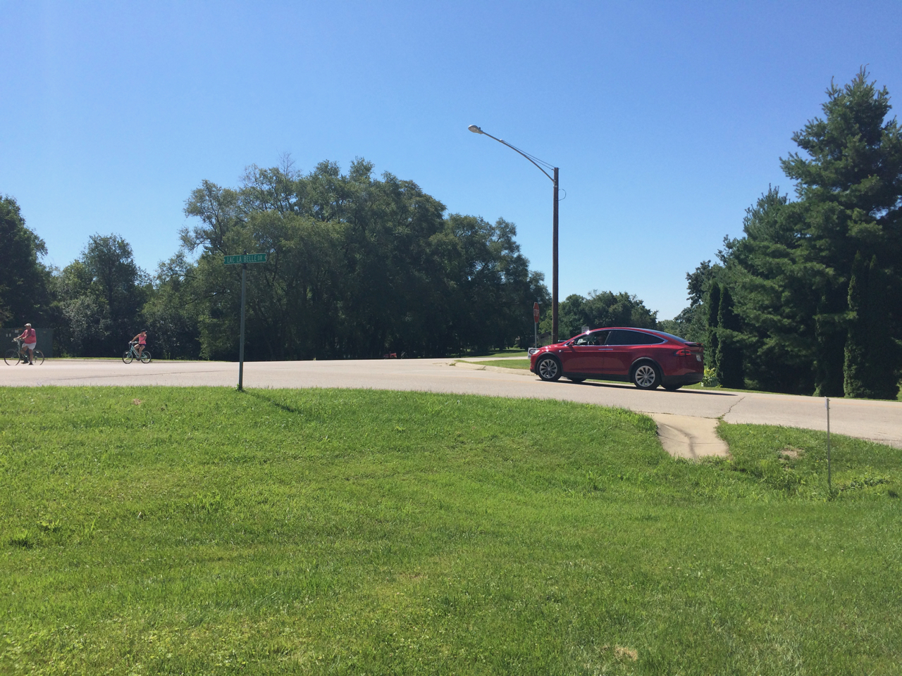 Finally now THIS morning, I get a call out of the blue from a California phone number. It was a woman who got my phone number through PlugShare. She was traveling from Chicago to Minneapolis in a Tesla Model X and had stayed at a local hotel last night, but was only about to charge from a 120V outlet. That wasn’t enough juice to get her to the next SuperCharger (in Madison, WI.) The vehicle was also still very new to her, so she didn’t have much experience with what to expect for charge times, 120 vs 240V, or know too much about the various power adapters. I gave her directions to my place, and not too long later, a bright red X pulled up.
