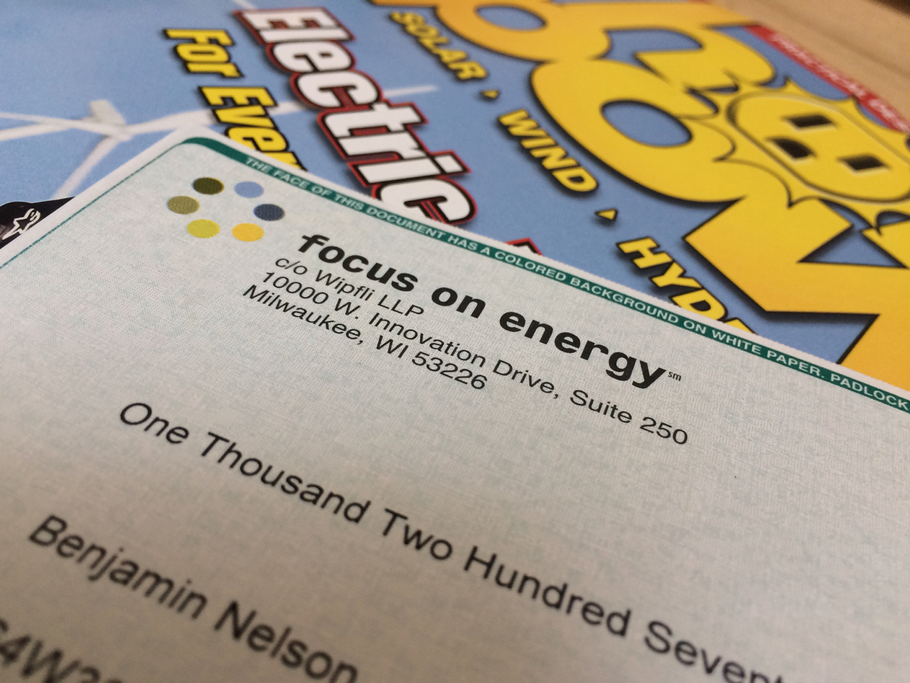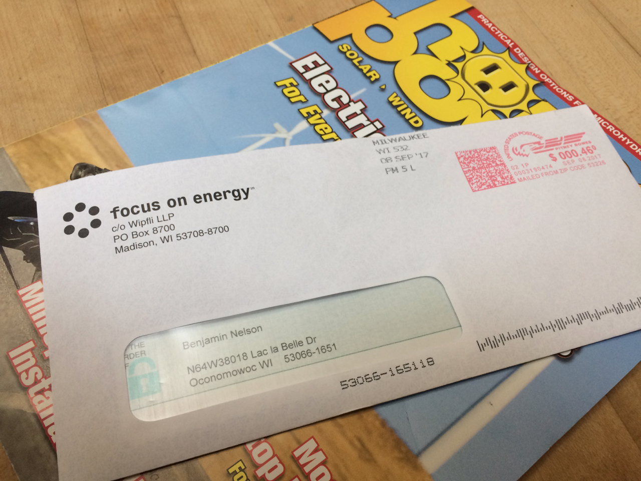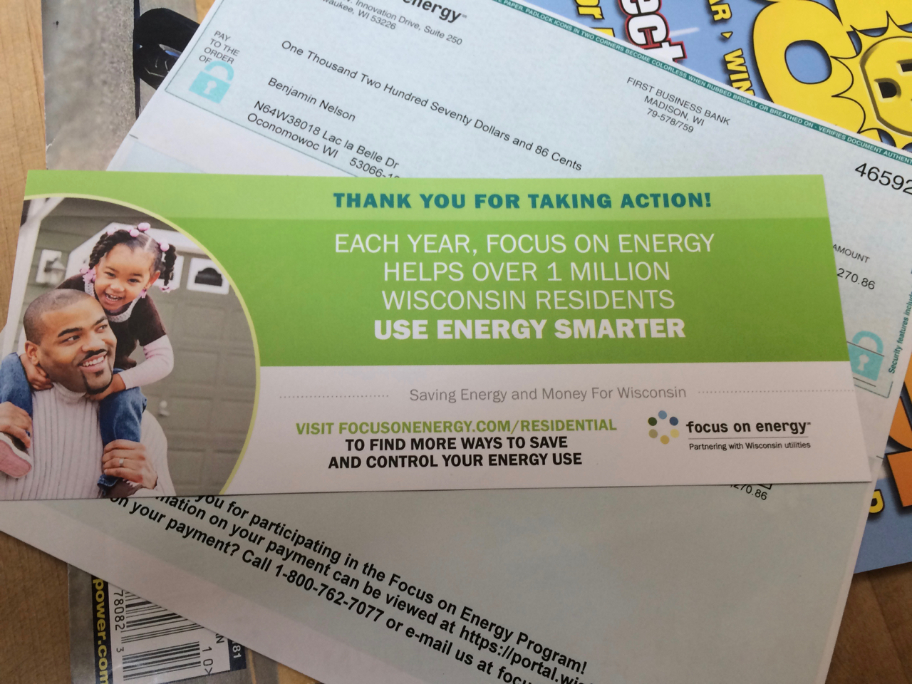 I was pretty excited today. When I went to my mailbox, not only did I get my latest issue of HOME POWER magazine, I also got an envelope from Focus On Energy. Just above my name and address, I could make out the words “PAY TO THE ORDER OF”…