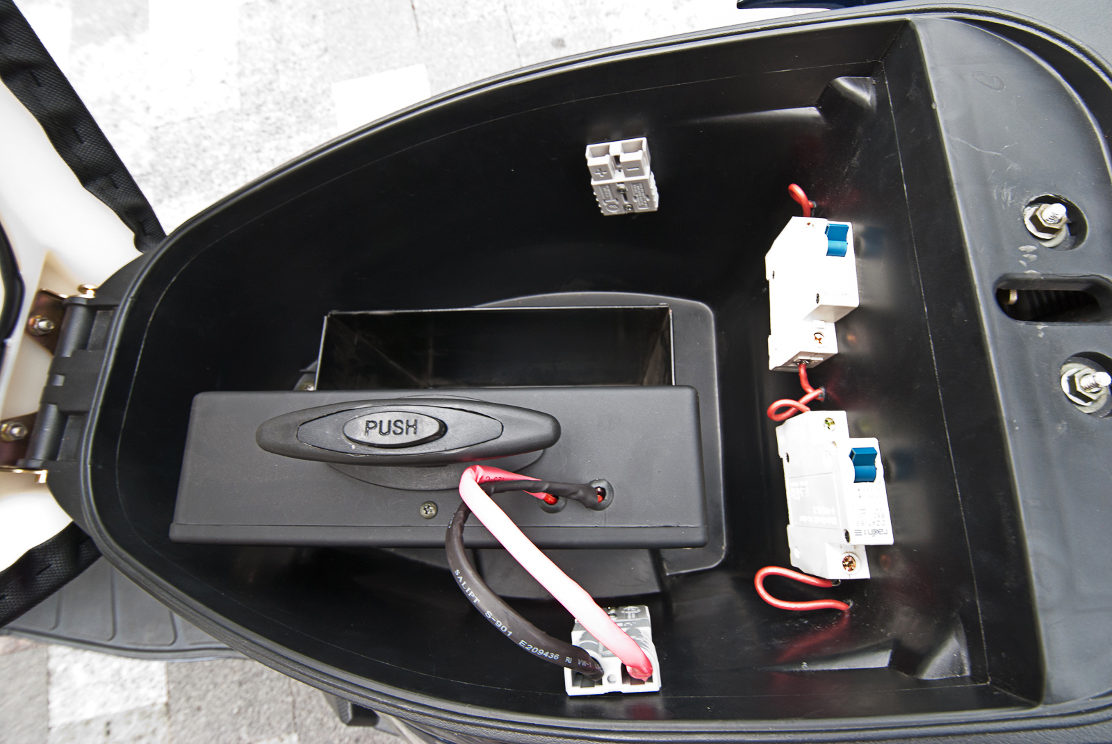 That’s why I was excited to recently hear from Matt at Flux Mopeds. A while back, they had a few of their scooters available for sale, but WITHOUT battery packs. For anyone who could build their own battery pack, it was a great, inexpensive way to get into an all-electric ride without a lot of money. I got one of the scooters and built a pack for it from some Nissan Leaf cell modules I had. Since the scooters were originally designed for a removable pack, they feature a pair of 50A Anderson quick disconnects and DC circuit breakers, making connecting your own pack very simple.
