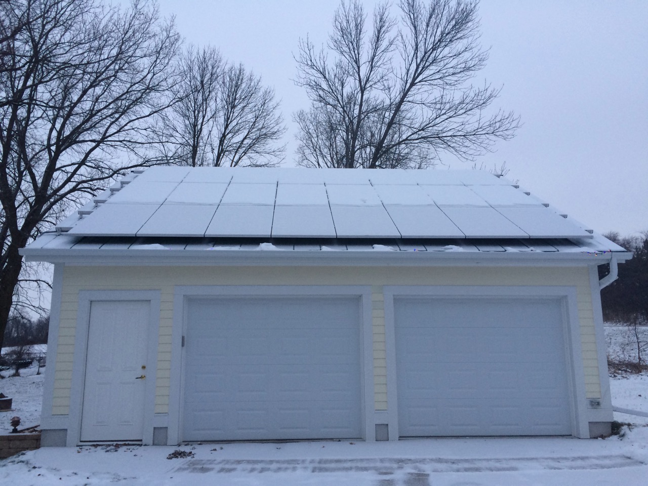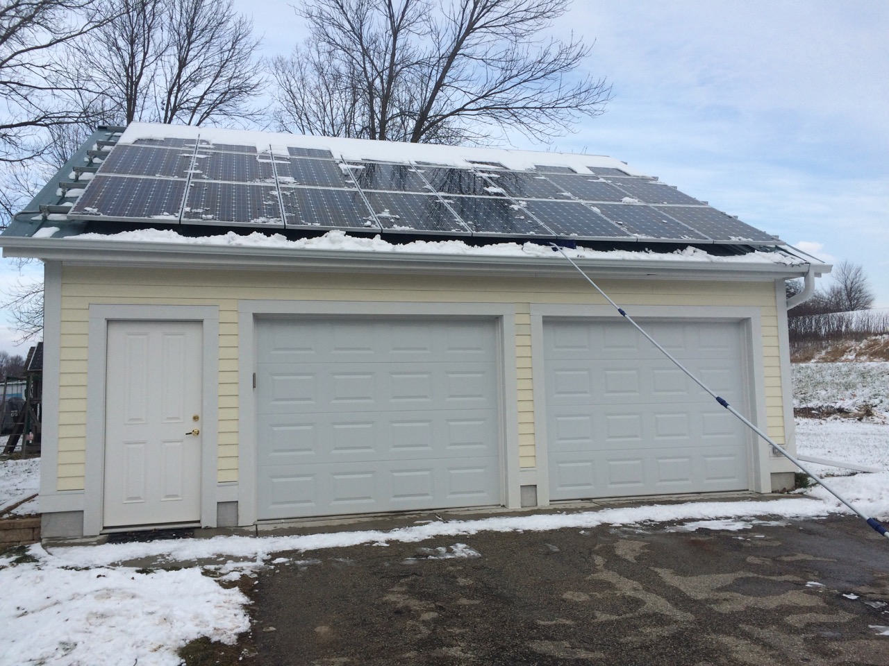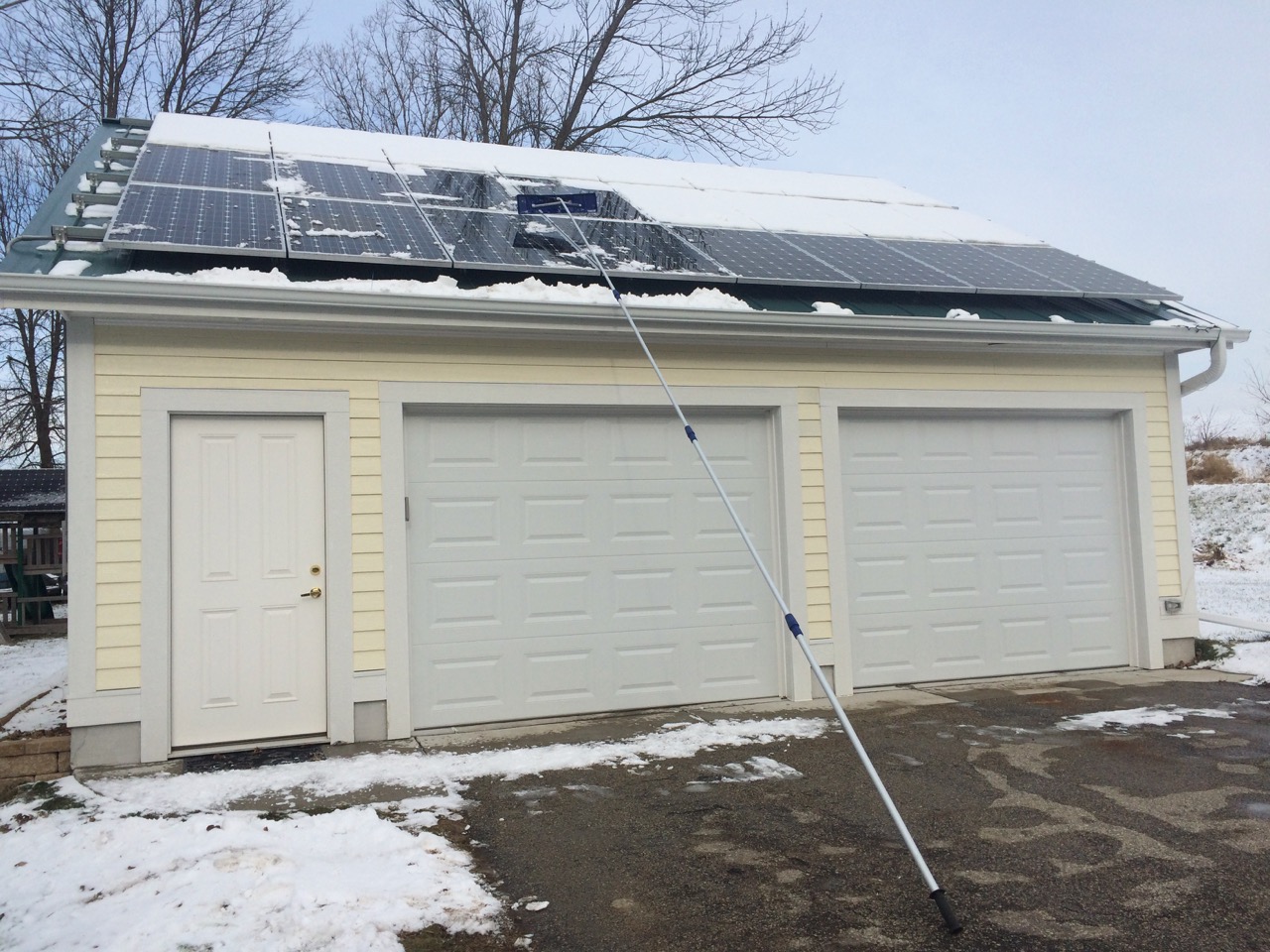 A few days ago, we got the first snow storm of the year. Not a big deal, but that was the first snow we had since I installed the solar array on my garage. I found that using a broom, even from a ladder, I could only clear the lowest of the three rows of panels.