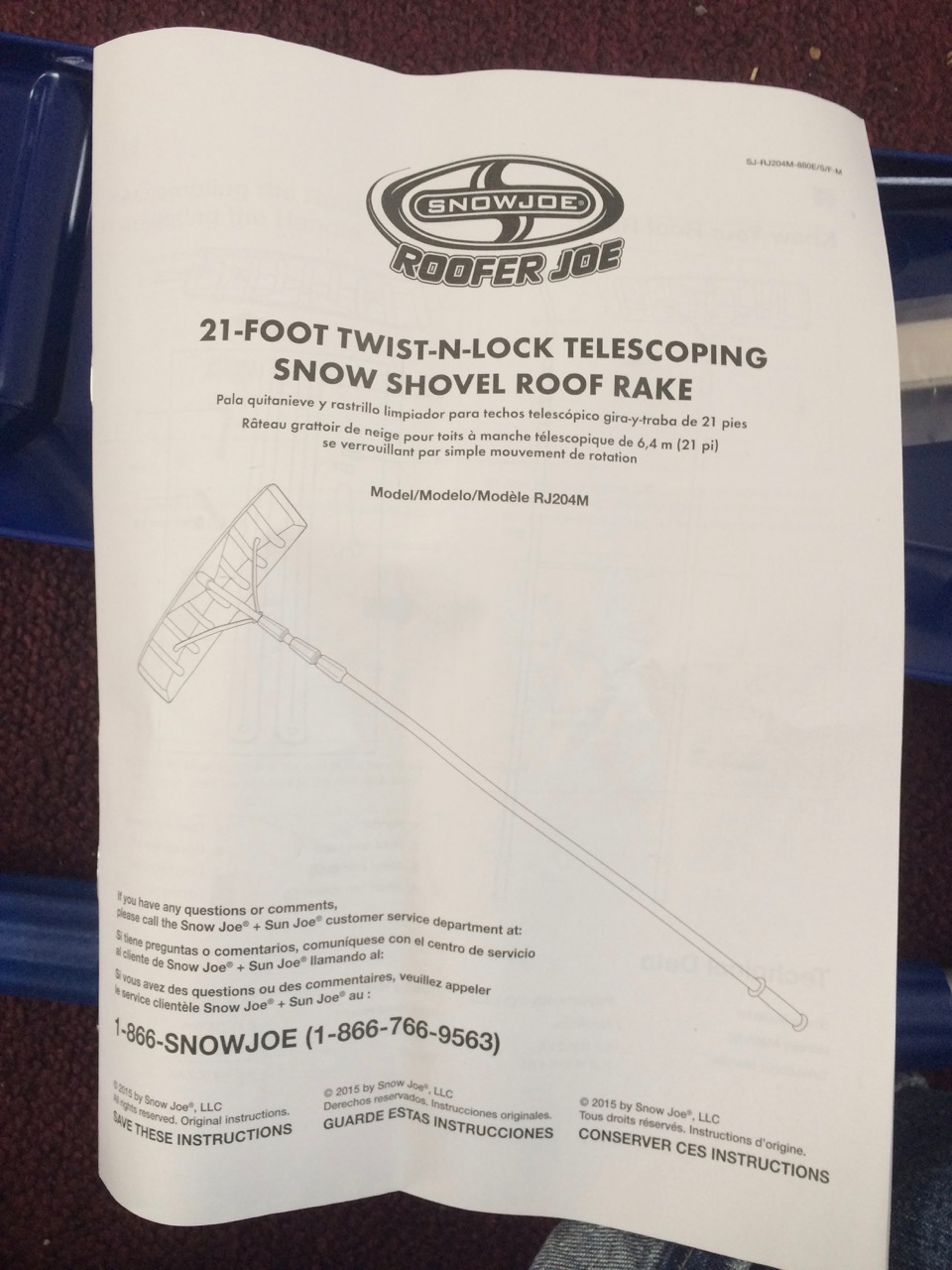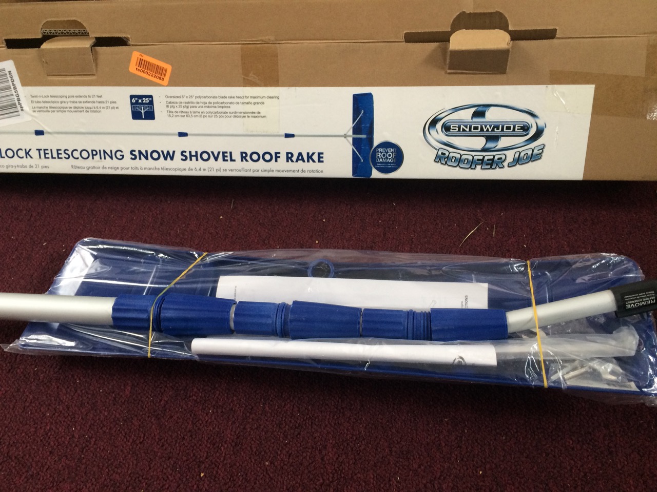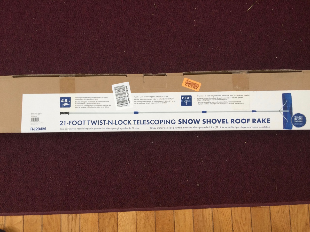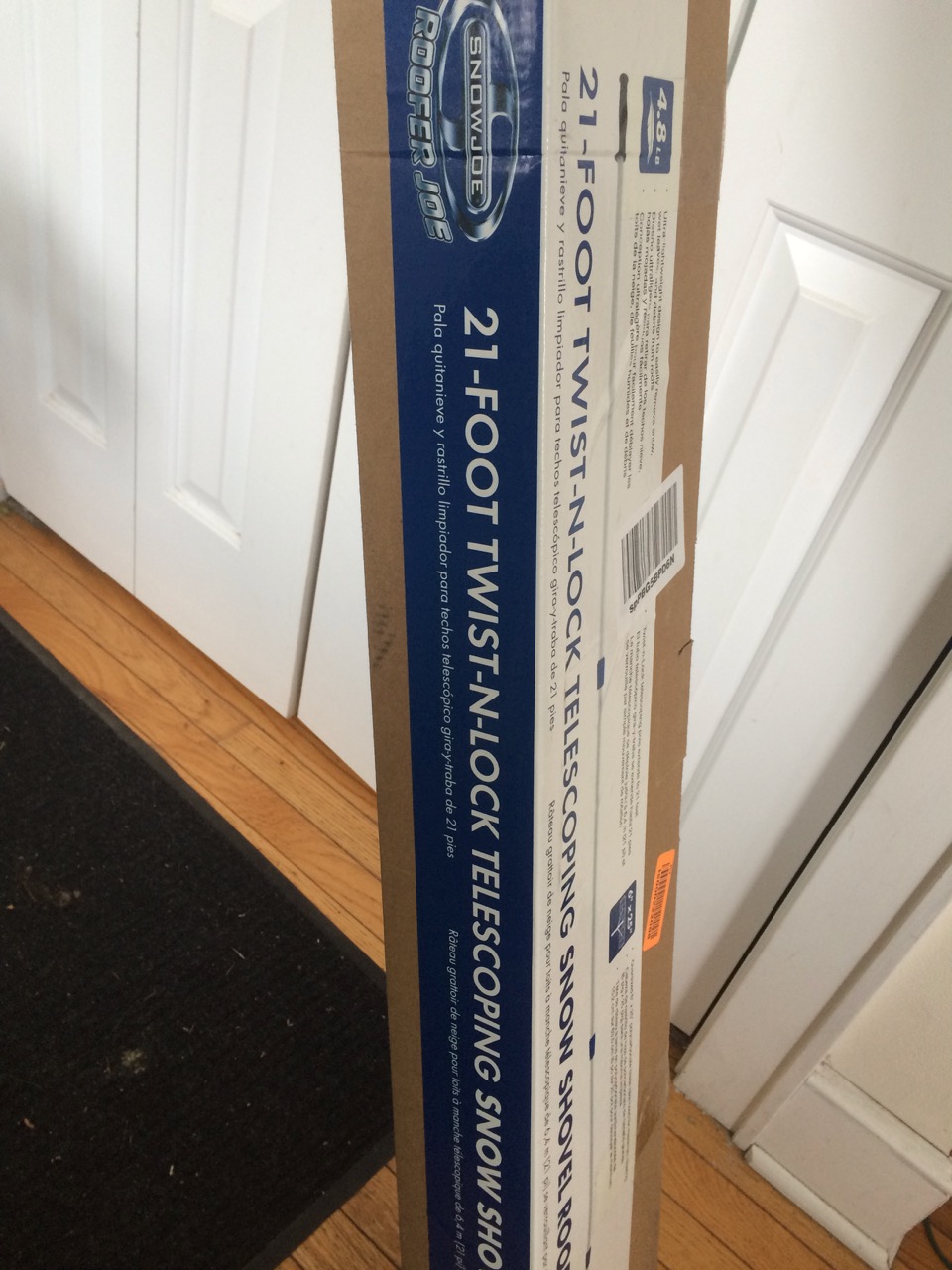 Last night, we got another dusting of snow, and as luck would have it, my roof rake showed up as well! It’s a SNOWJOE 21-Foot Twist-n-Lock Telescoping Snow Shovel Roof Rake Model RJ204M. Assembly was easy, just pop the plastic blade onto the end of the telescoping pole and screw on two small aluminum braces.