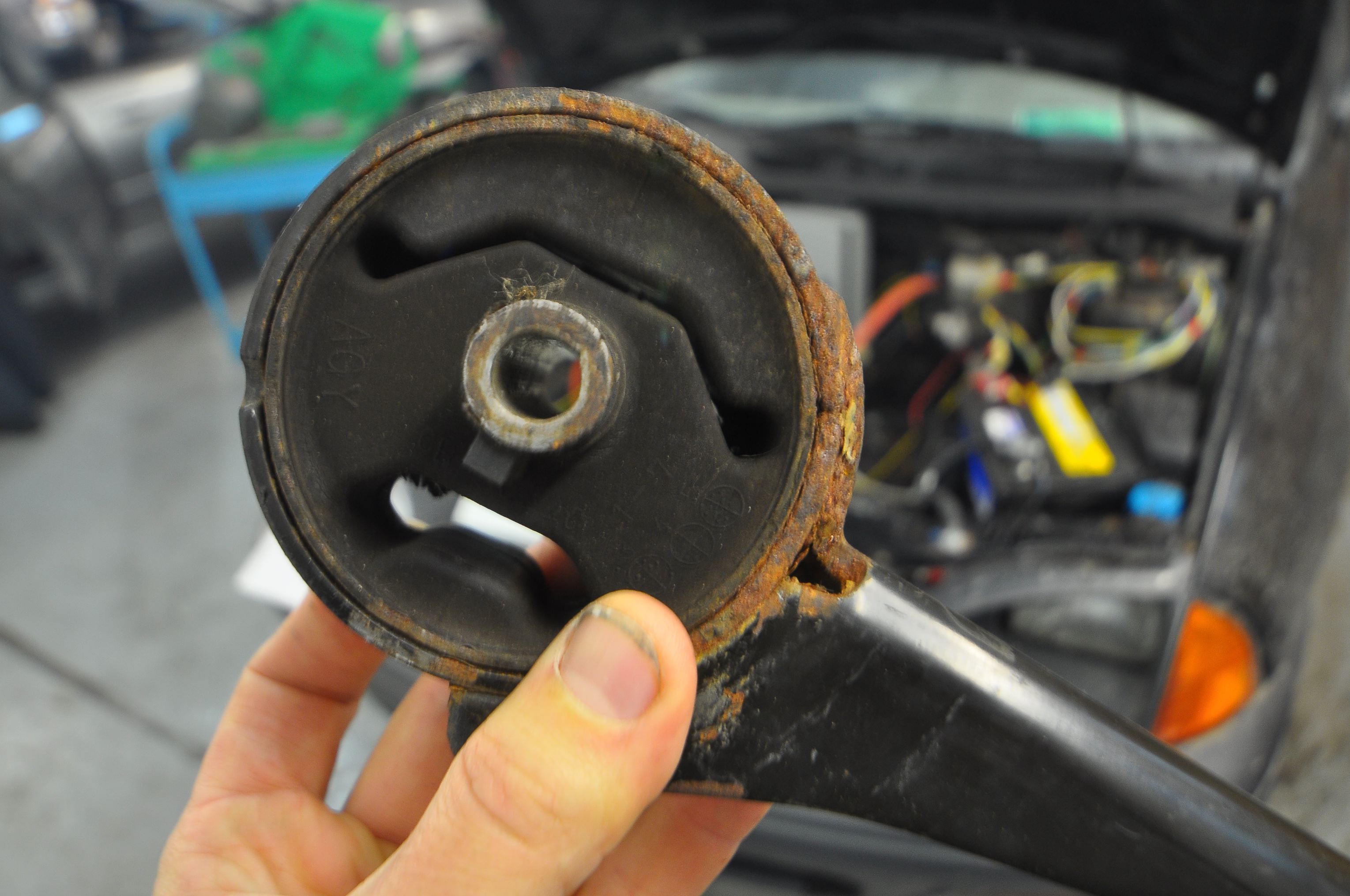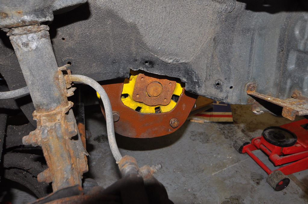 We slid the bracket into the car, drove in the bolt that held the bushing in place, jacked up the motor, and ran in two large bolts connecting the motor to the bracket.