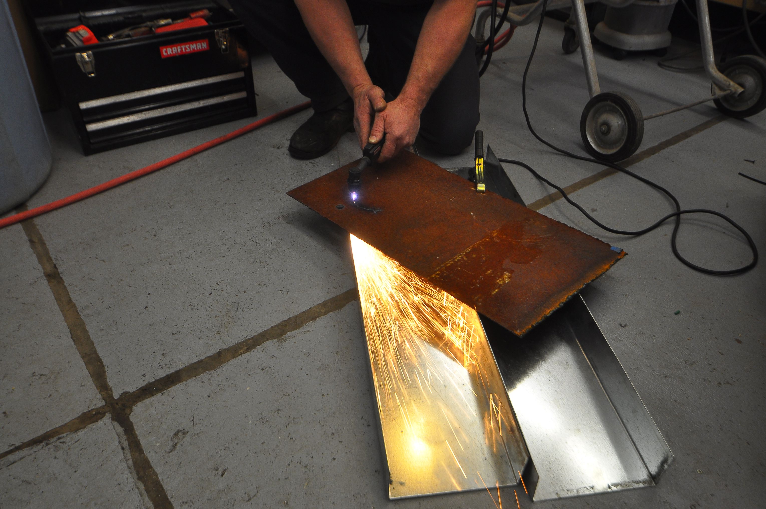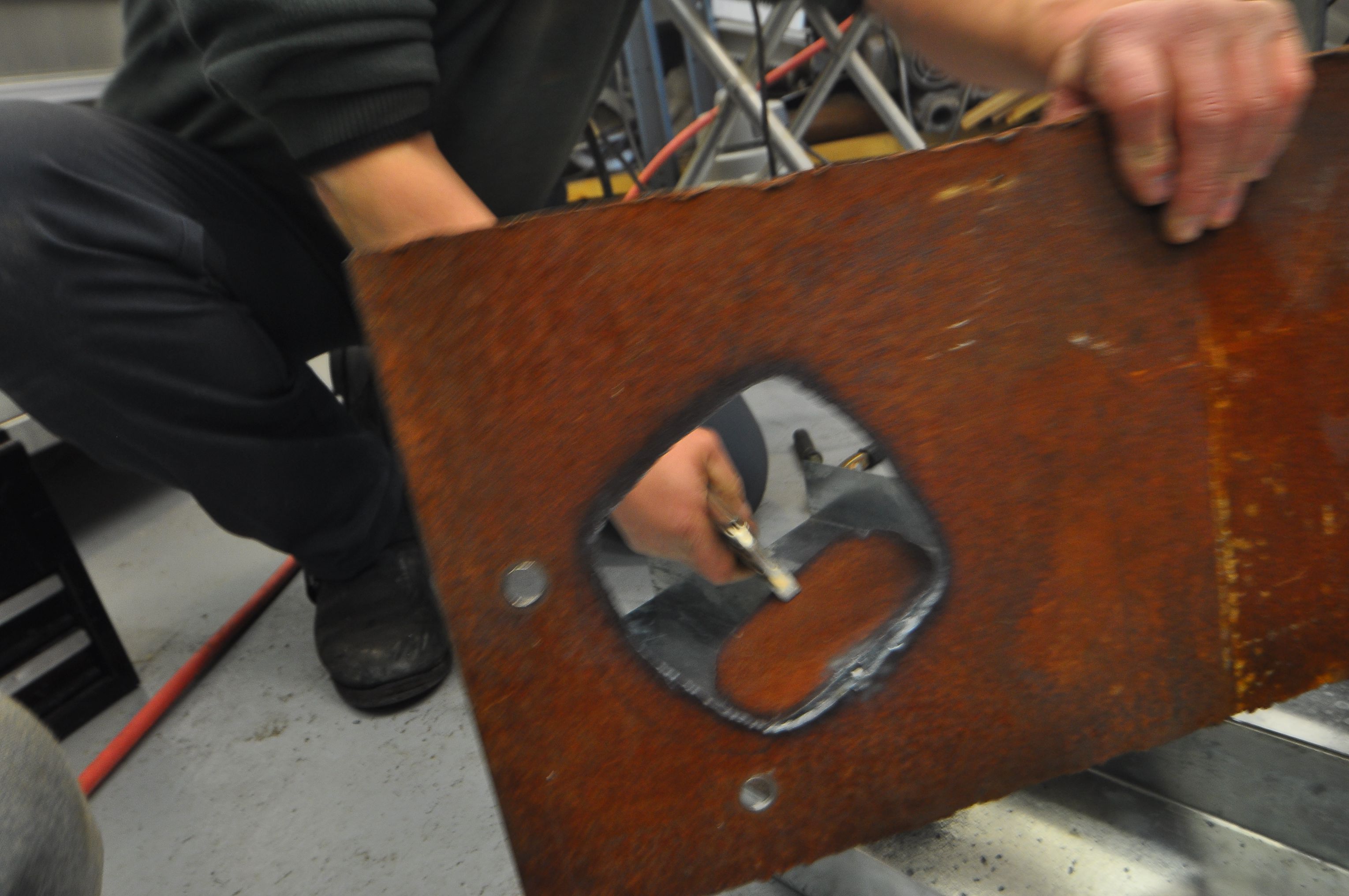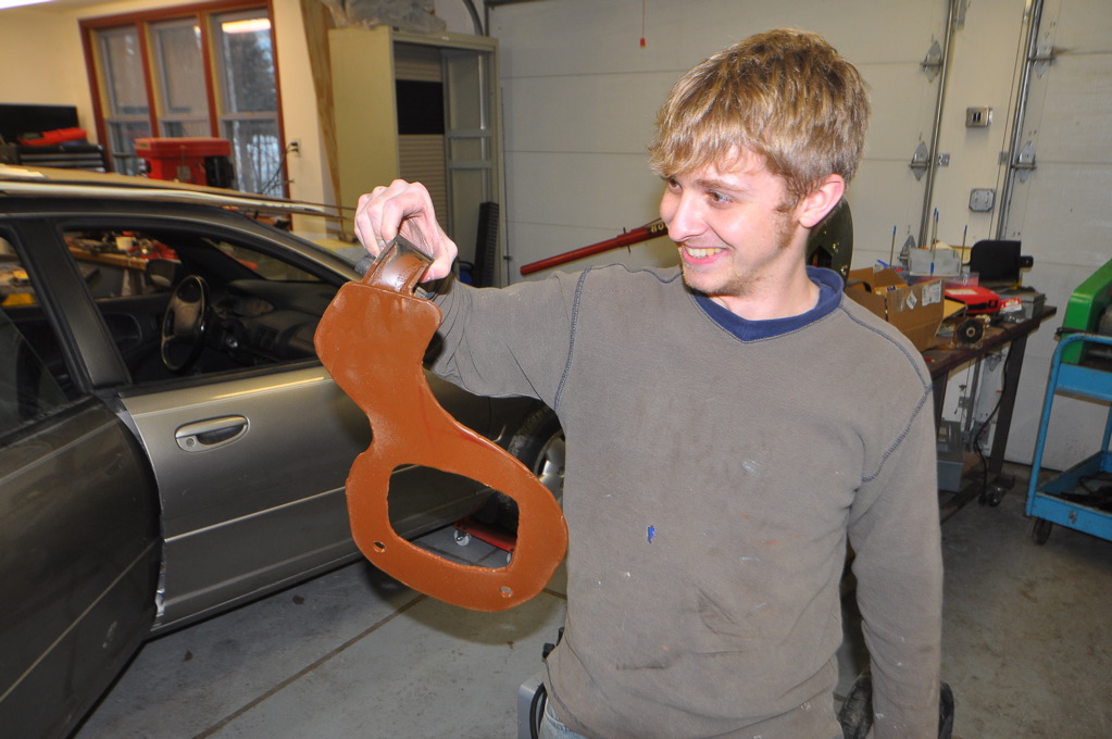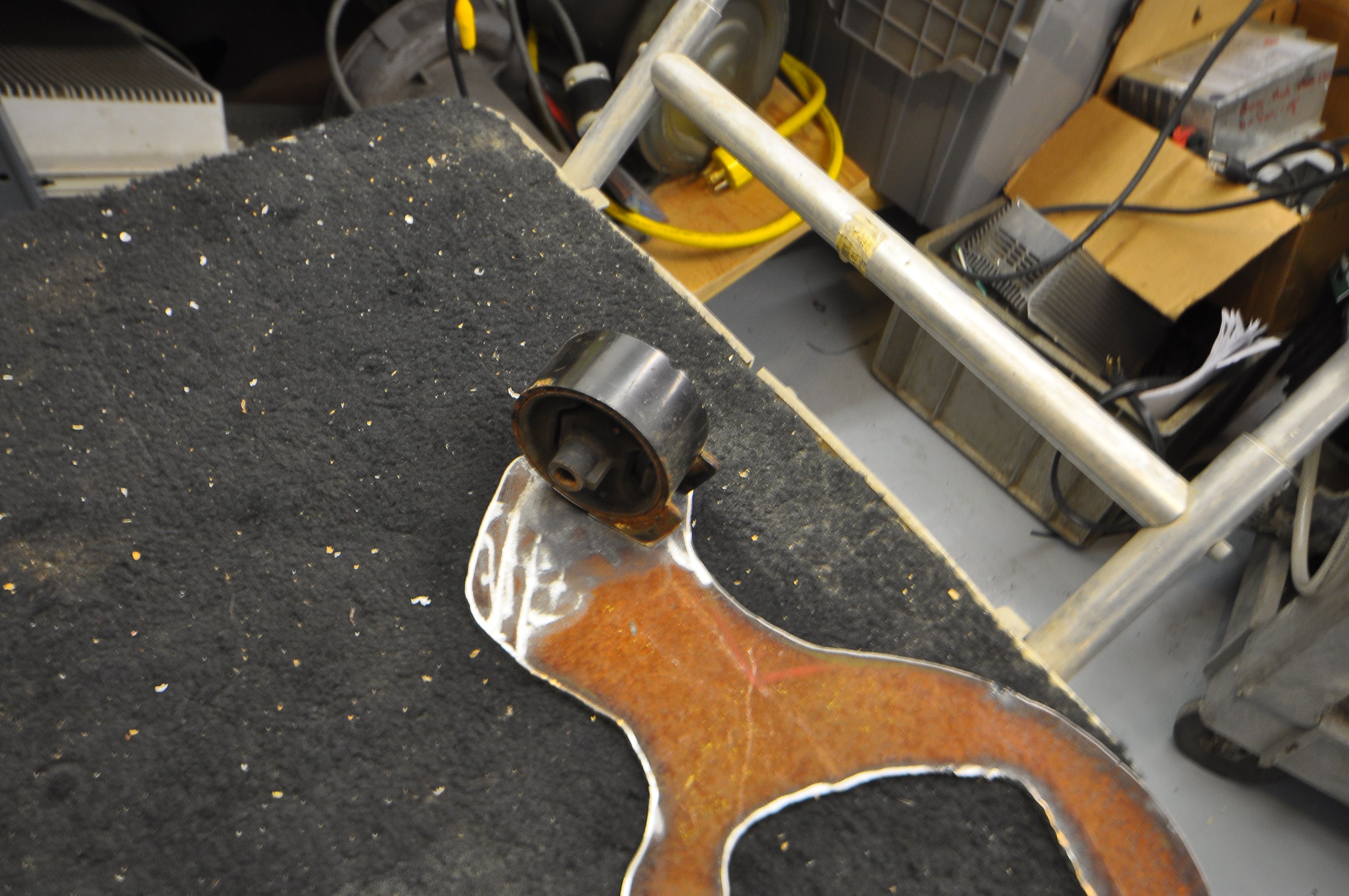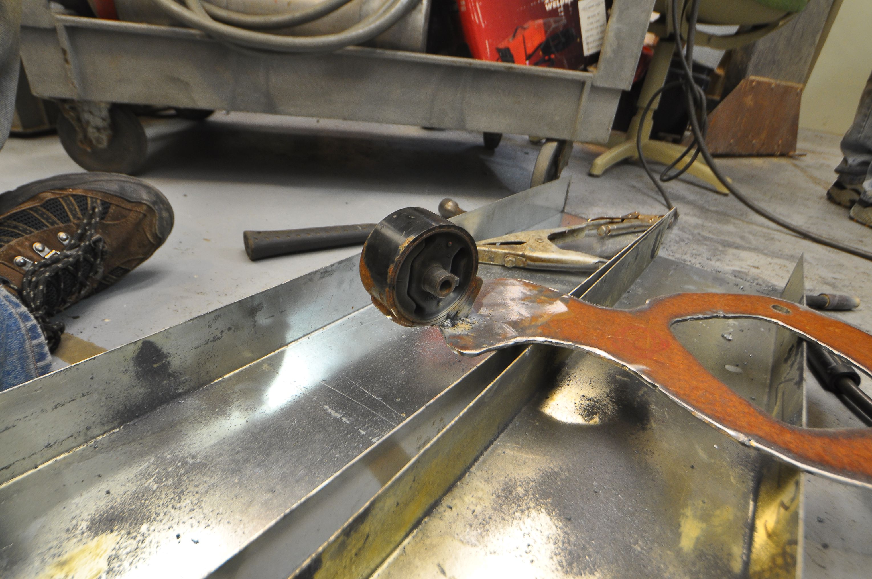 After making a tagboard template and testing it in the car, we set to work cutting the steel. We used the plasma-cutter to cut out the general shape from a piece of 1/8″ steel. We also cut the center and drilled out the bolt holes. The metal was rusty, so we made sure to first grid down a spot for the ground clamp. Likewise, we had to clean up some rust before welding the steel-surrounded rubber bushing that would mount the bracket to the frame of the car.