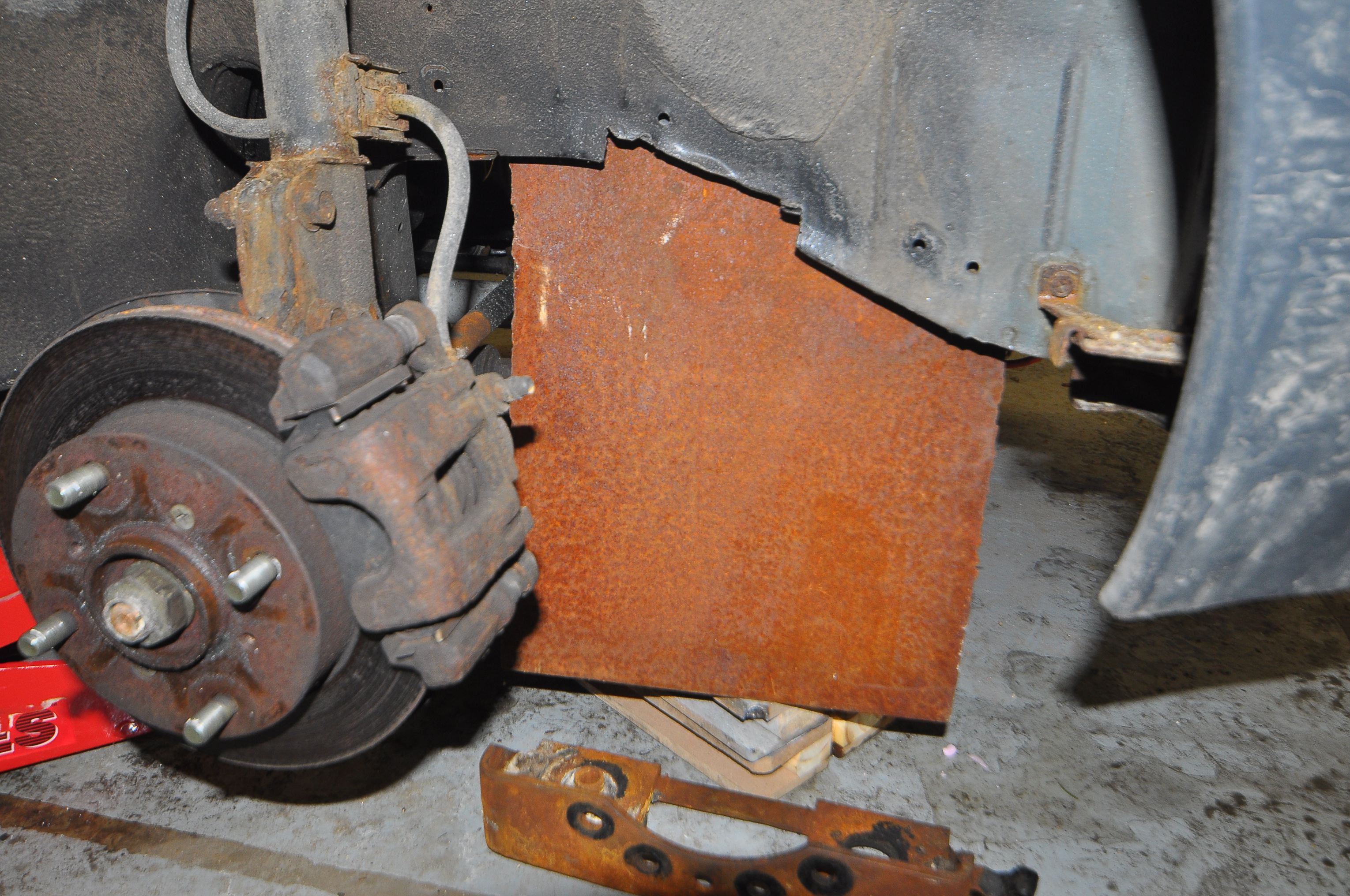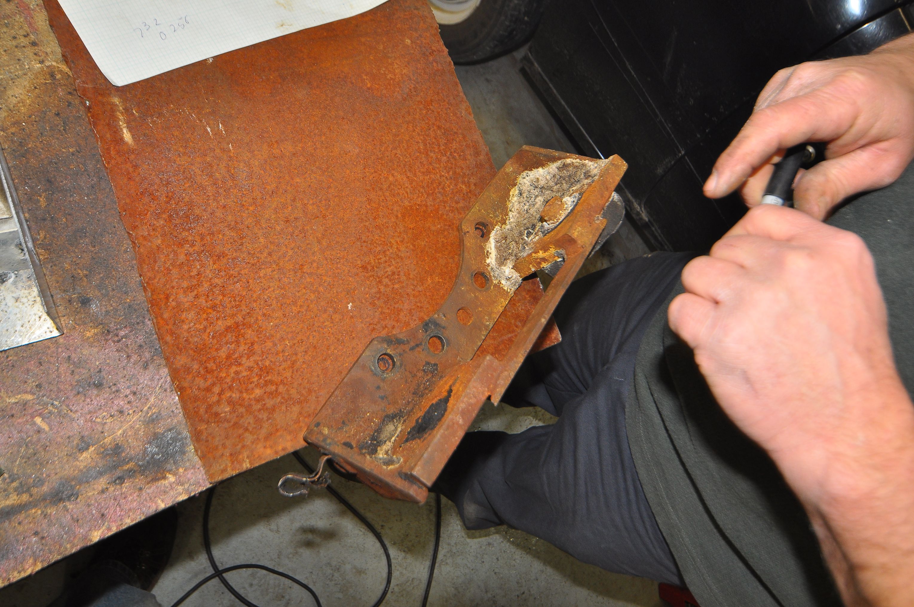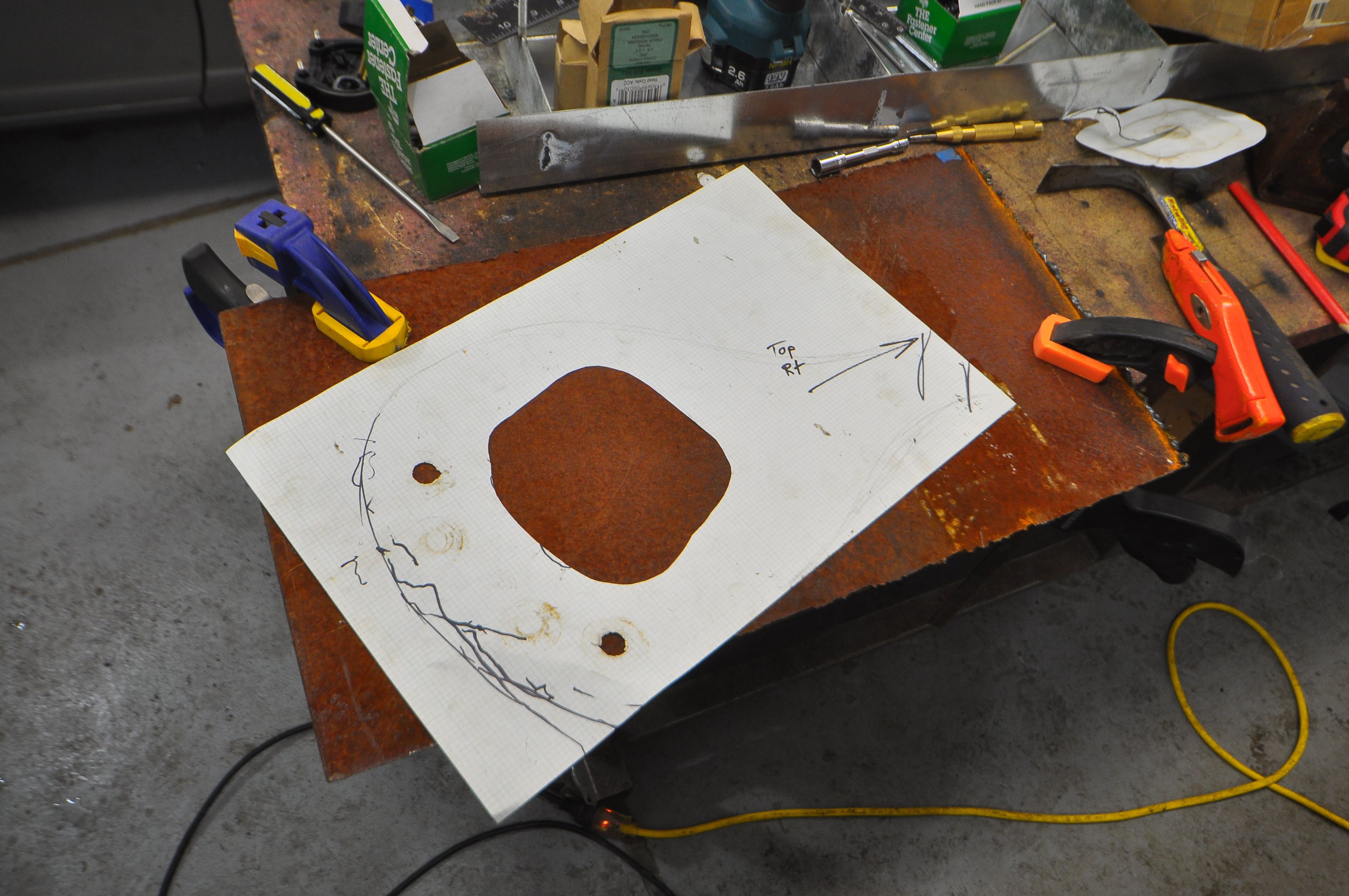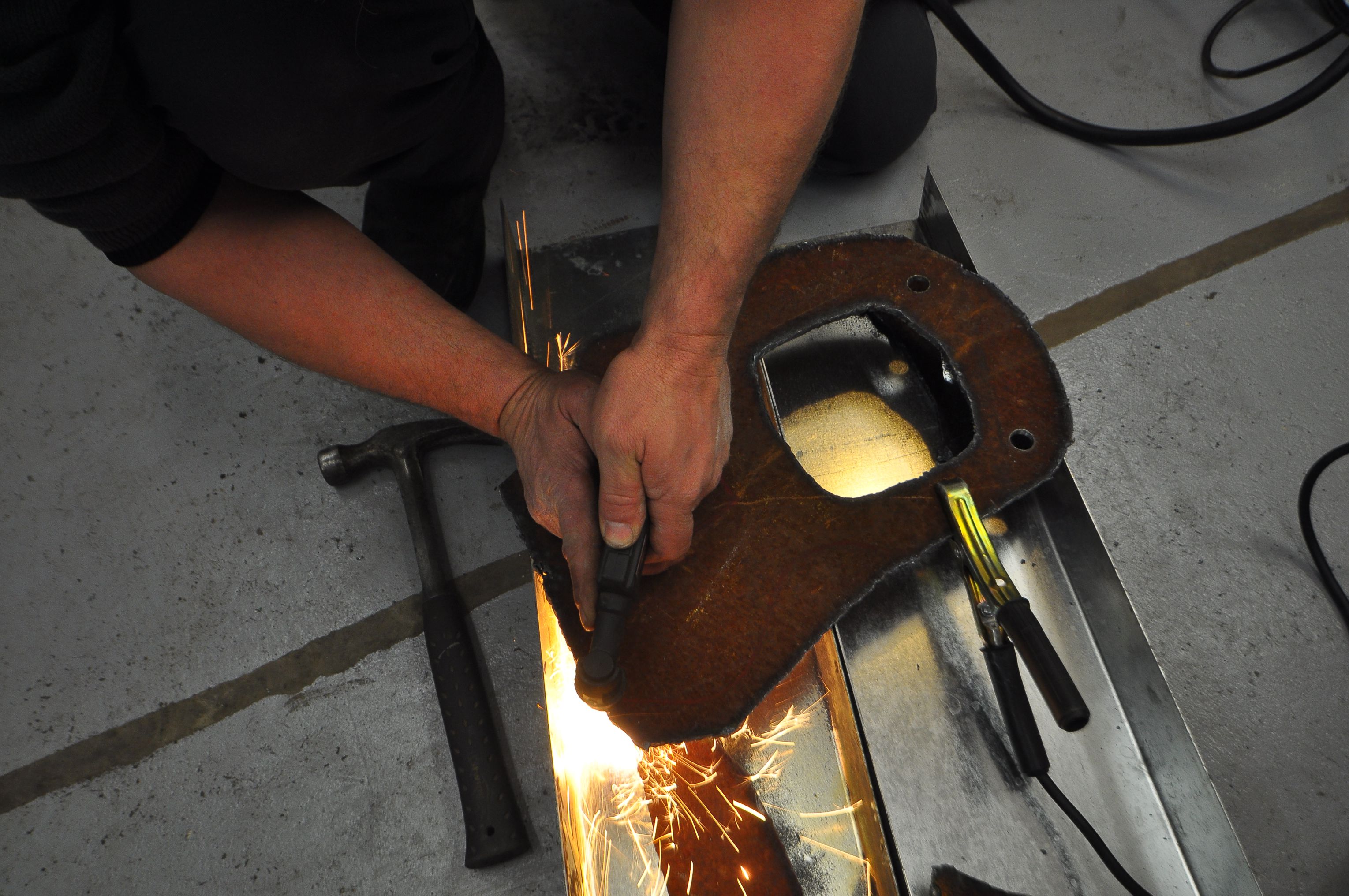 After making a tagboard template and testing it in the car, we set to work cutting the steel. We used the plasma-cutter to cut out the general shape from a piece of 1/8″ steel. We also cut the center and drilled out the bolt holes. The metal was rusty, so we made sure to first grid down a spot for the ground clamp. Likewise, we had to clean up some rust before welding the steel-surrounded rubber bushing that would mount the bracket to the frame of the car.