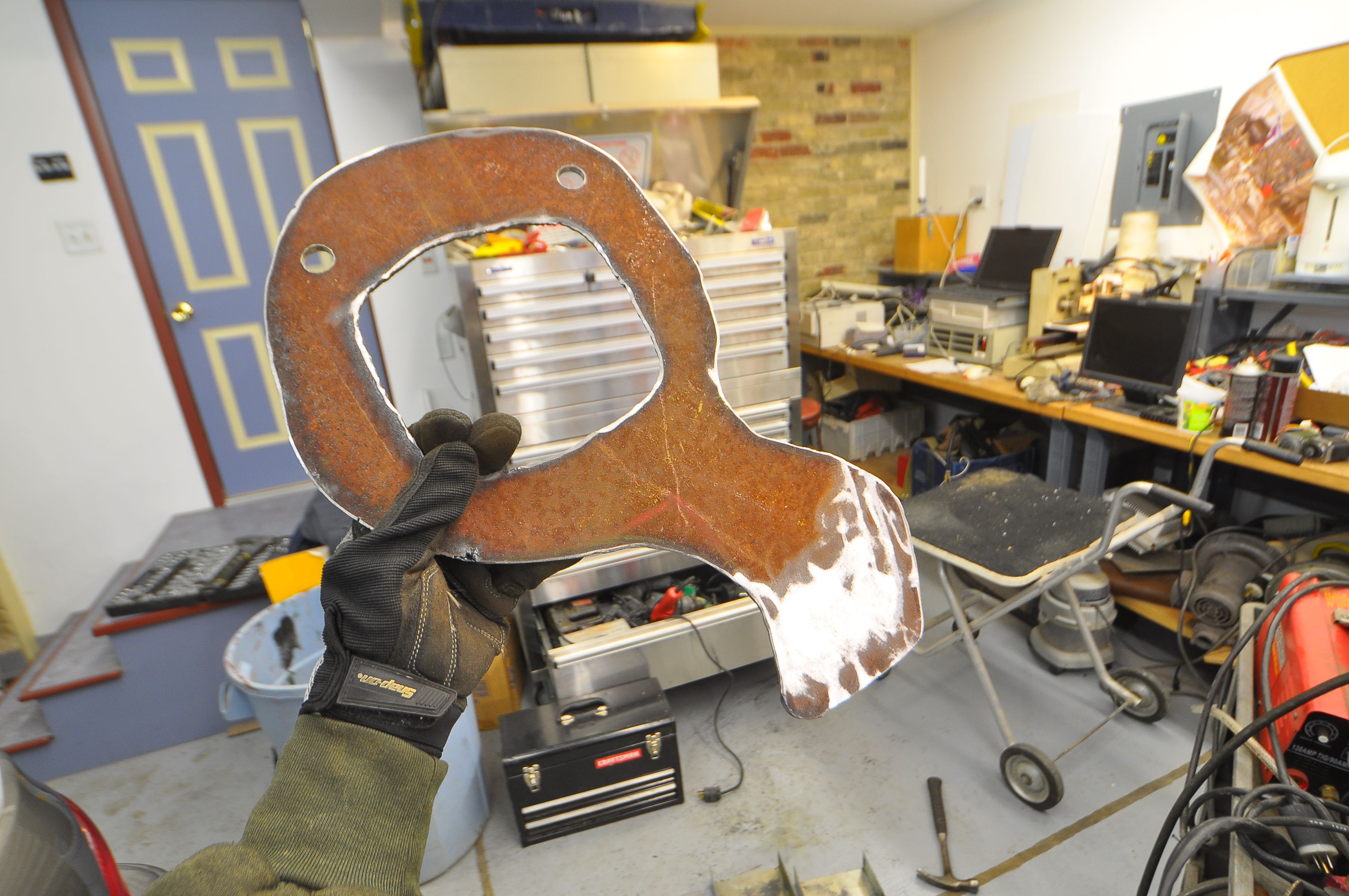 Once the cutting and welding was done, a coat of Rustoleum Rusty Metal Primer covered the entire “Q” with a pasty protective coating.