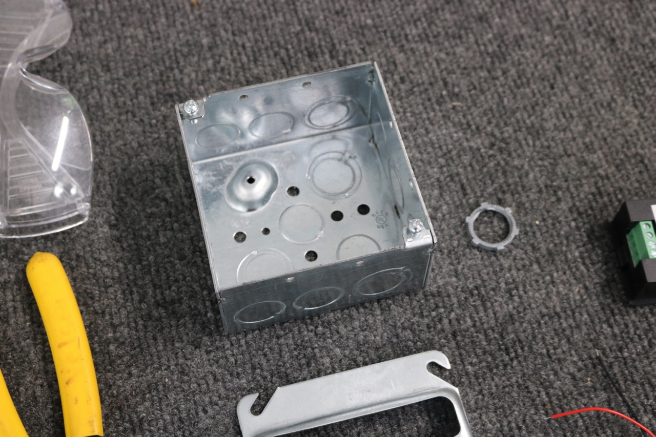 Next, it was time to make the panel meter fit the single gang metal cover. I used a Dremel rotary tool to grind away almost all of the two tabs which would normally take the screws of a single-gang device. Once done, the panel meter can snap into place.