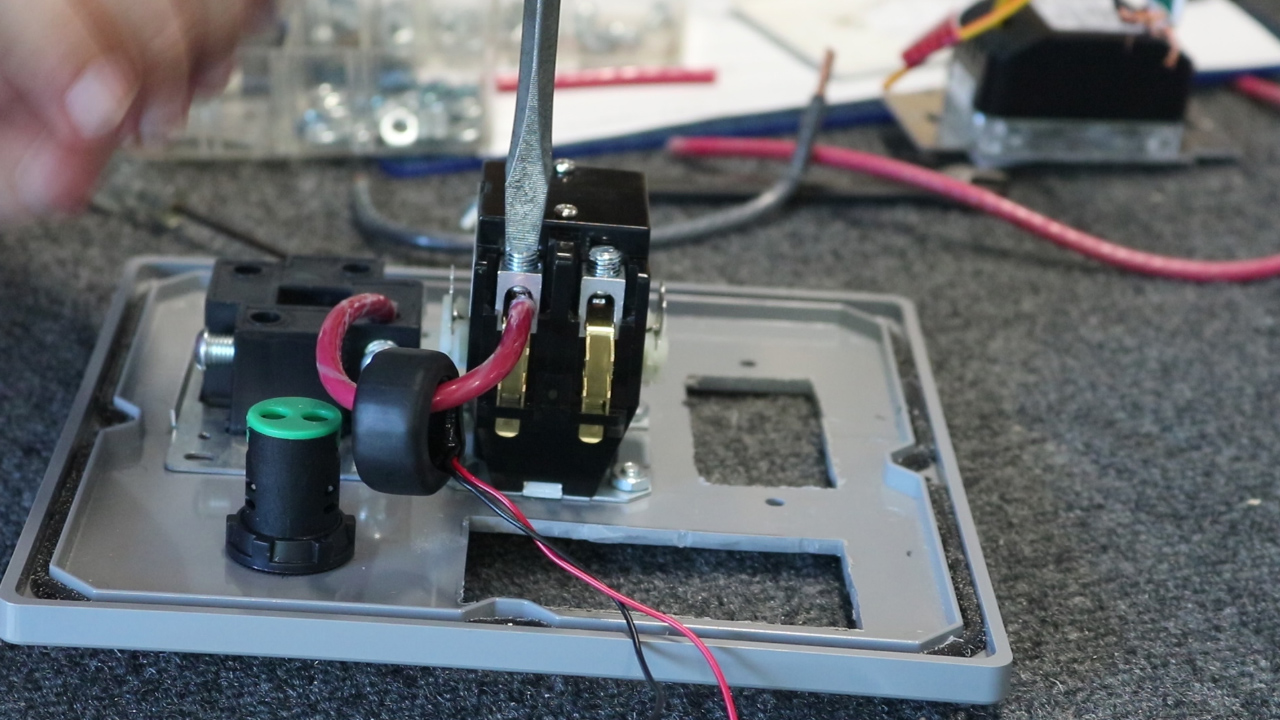 I set to work by laying out the components to fit on the lid of the 8 inch box. I arranged them in a logical order and traced the components so I would know where to cut the holes. I drilled the hole for the power indicator light with a 7/8″ spade blade and the hole for the NEMA 14-50 outlet with a 2.125″ hole saw. The two square holes were made with a Dremel rotary tool with a fluted spiral cutter bit.