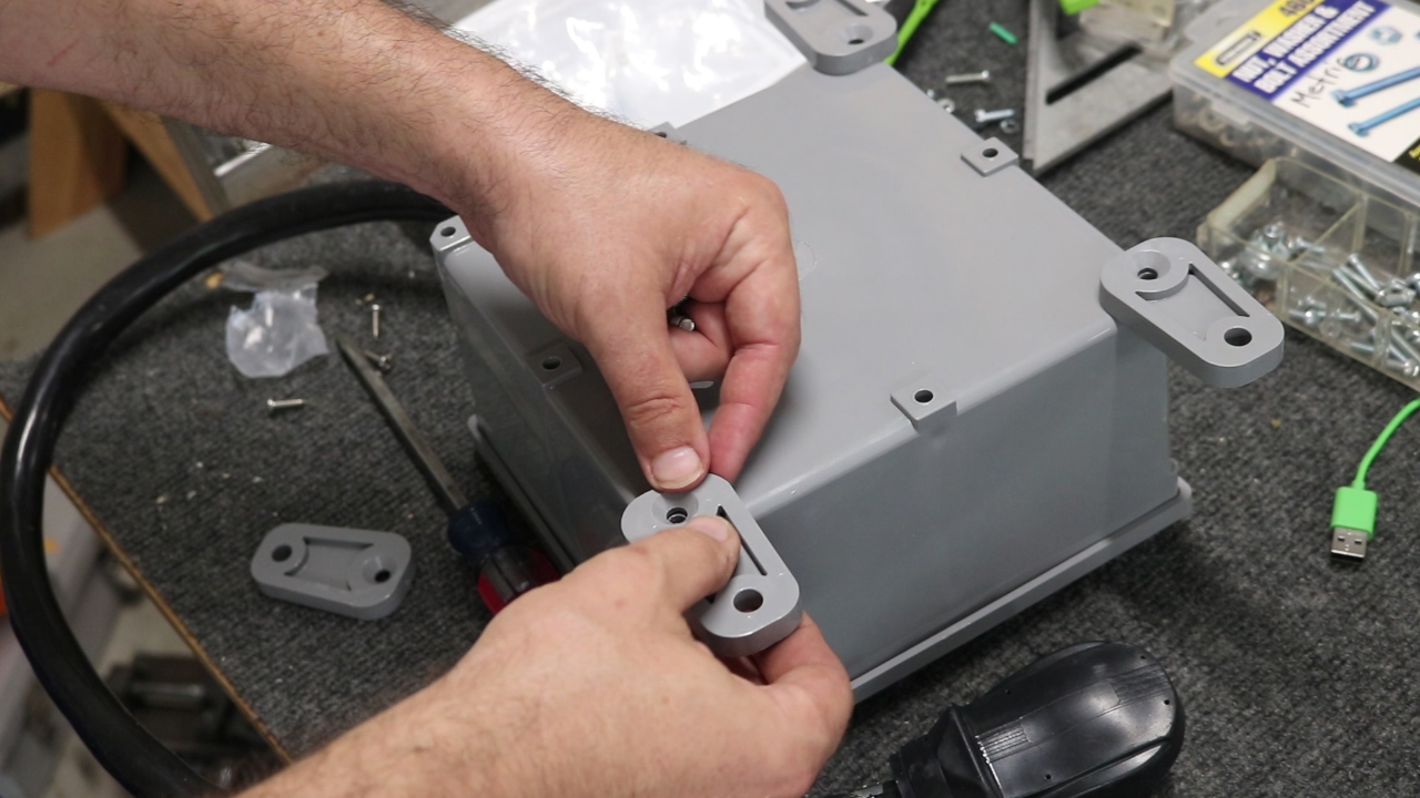 I attached the faceplate to the box and screwed it down. On the back, I attached the feet that would become mounting points for the box.