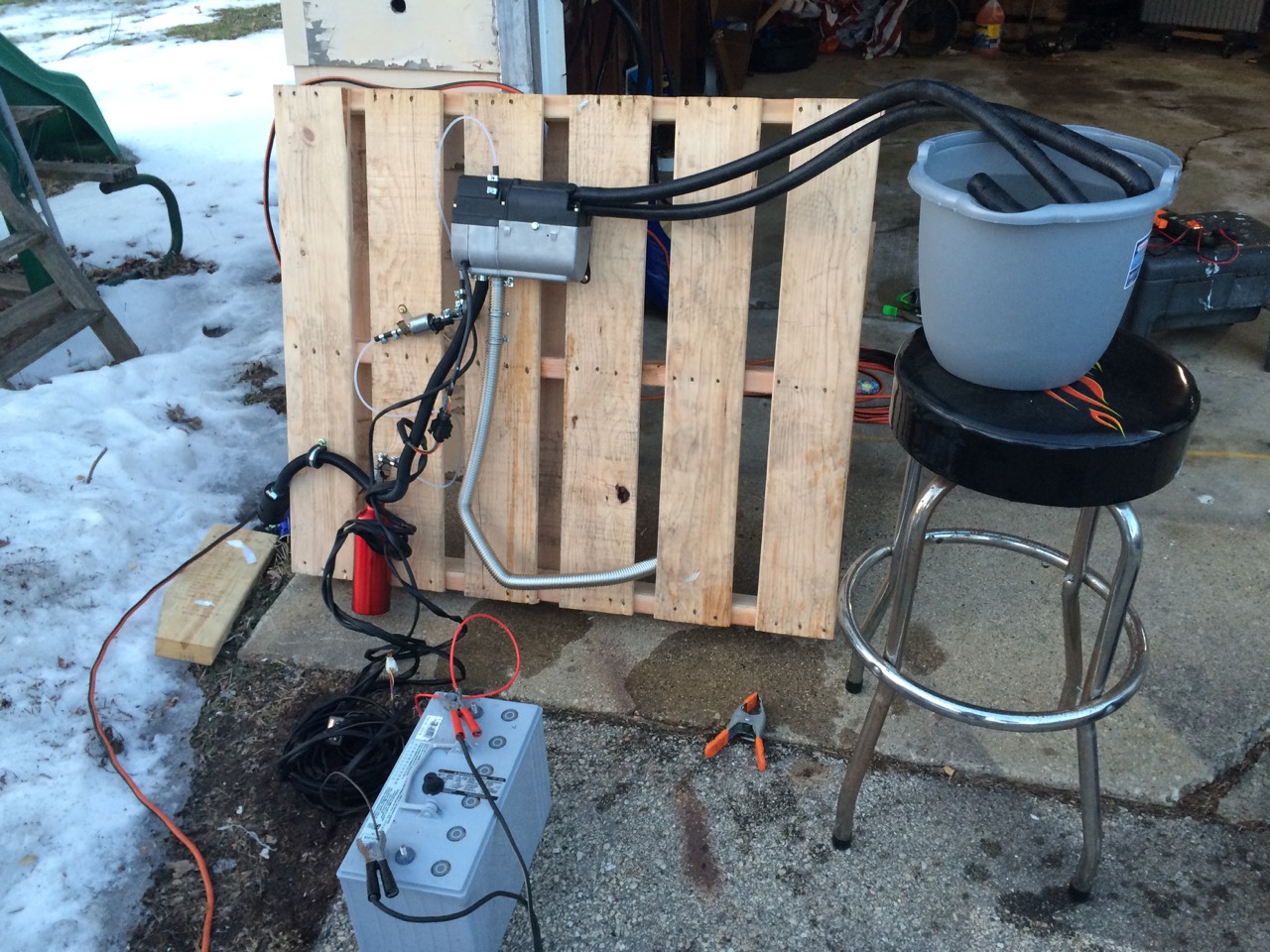After the heater arrived in the mail, I first rigged it up on a stand in my garage to learn what I needed to do to hook it up and test it. I also shot some thermal video of the heater running hot water into a bucket as an initial test.
